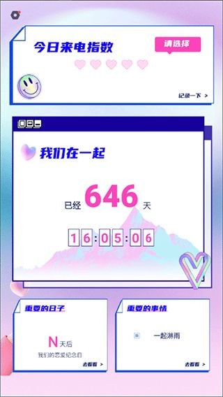 3、帮助你计算恋爱天数、提醒即将到来的纪念日等等恋爱点滴。