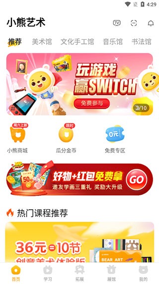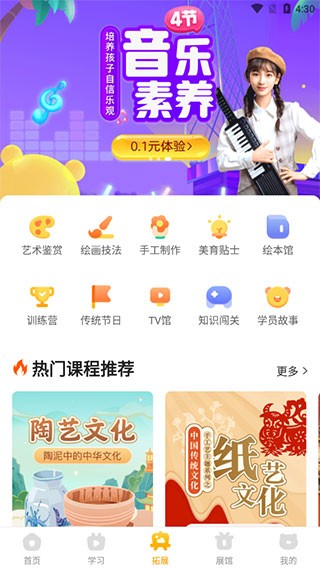 1、进入软化后,在首页中可以看到美术馆、文化手工馆、音乐馆、书法馆课程进行学习。