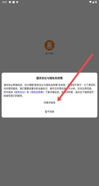 1、打开进入橙子表单app里,可以去点击同意并进入。