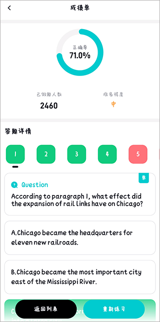 4、阅读示例题型练习后,系统打分并提供错题分析。