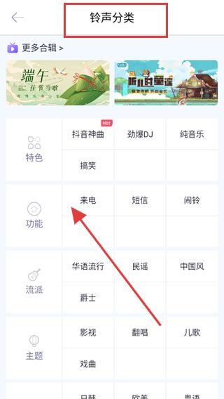 2、铃声分类页面里找到来电分类点击进入对应铃声列表,查看来电铃声资源。