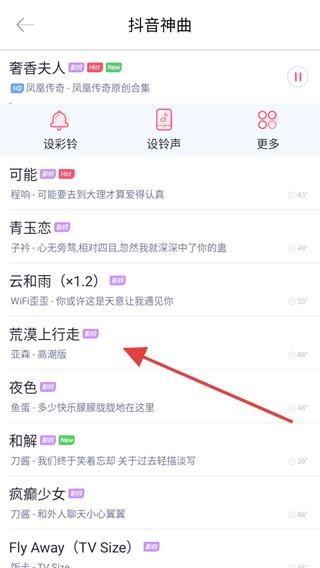 3、滑动查找目标铃声如荒漠上行走,点击该铃声进行设彩铃来去完成铃声设置。
