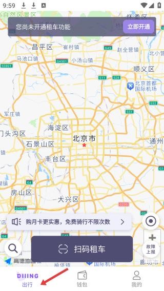 1、打开进入叮达出行共享单车在去点击出行呈现地图,设有扫码租车等功能可以选择。