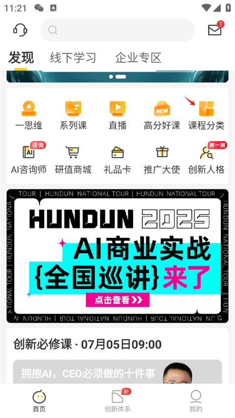 1、进入混沌大学教育课程首页可以去点击课程分类。