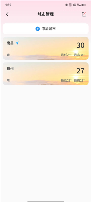 4、添加新的城市使用管理中的添加功能添加新的城市天气。