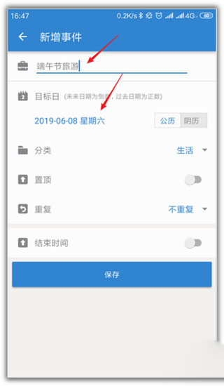 2、输入标题与日期,设定提醒的具体时间。