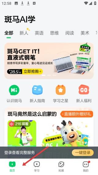 1、点击首页,分类标签清晰,呈现钢笔促销活动,设认识斑马等功能,开启多元学习之旅。