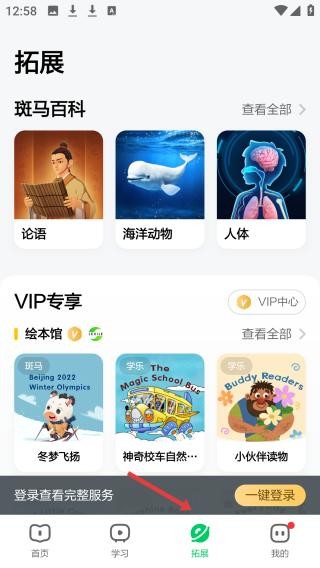 3、点击拓展页面含斑马百科与VIP绘本馆,从论语到海洋动物,丰富内容,满足不同拓展需求。