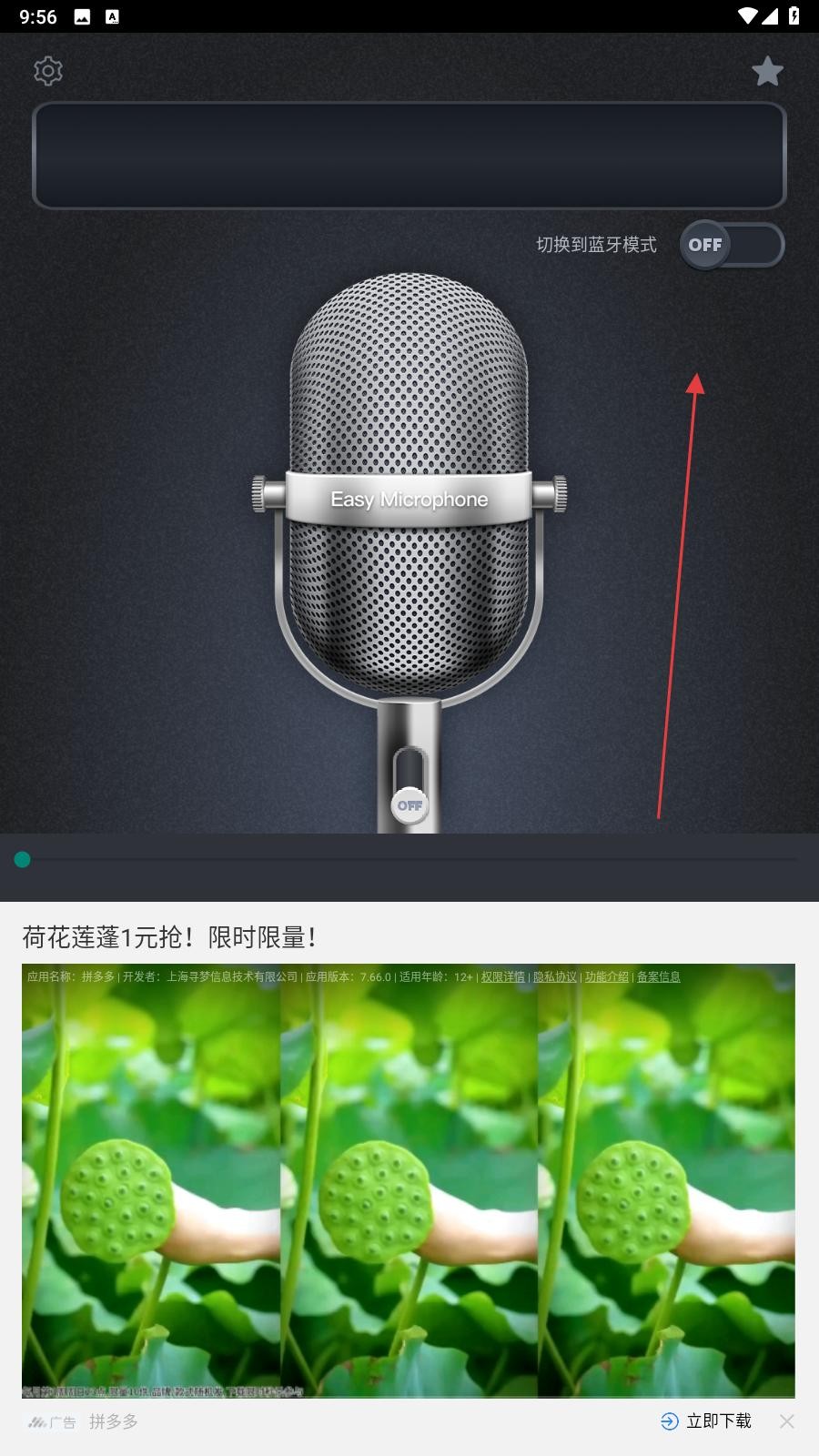 4、麦克风扩音器主界面,有输入框、蓝牙模式切换开关,界面呈现麦克风模型,下方有广告,可体验基础扩音与蓝牙连接功能。