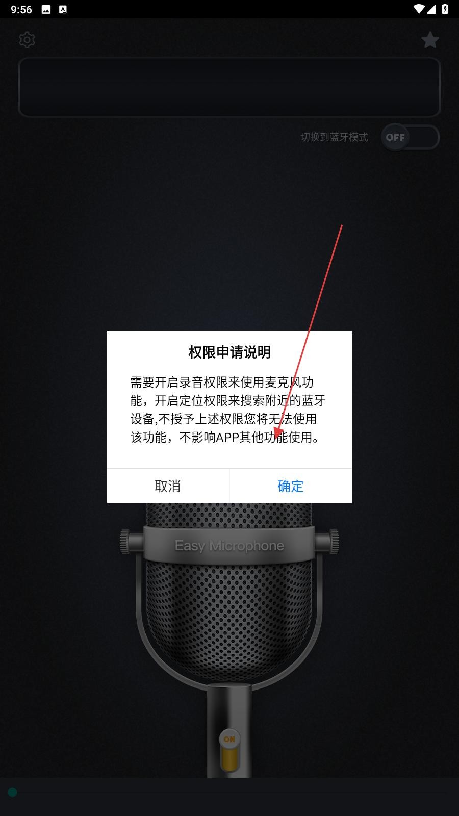 5、开启蓝牙模式时,弹出权限申请说明,需录音、定位权限,点击确定授予可连蓝牙设备,取消则无法使用该功能。