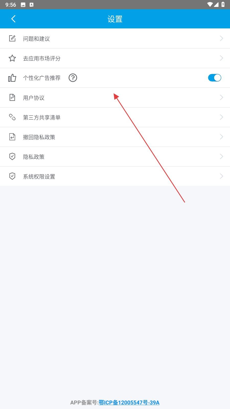 6、有问题建议、评分等选项,可管理个性化广告、查看协议政策,还能设置系统权限,调整APP使用偏好。