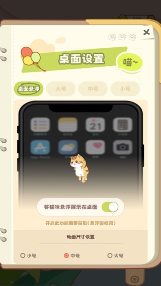 启用悬浮窗显示功能,猫咪才能在所有页面随时现身。