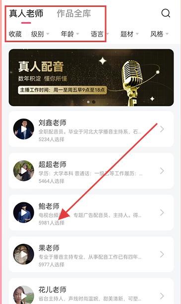 1、作品全库页面可按收藏级别等筛选,展示多位真人配音老师,含简介及选择人数,方便用户挑选适配配音师合作。