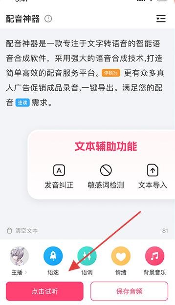 2、配音界面支持文字转语音,有发音纠正等文本辅助功能,可设置语速等参数,点击试听或保存音频,完成配音流程。