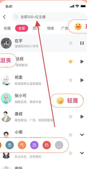 3、主播选择页设搜索栏,能按标签筛选,展示主播音色风格,用户快速找符合需求的主播,助力精准配音创作。