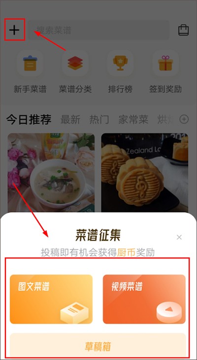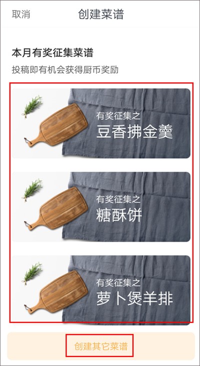 2、用户可参加软件内的有奖征集菜谱,这样可获得厨币,厨币可用于在软件商城内兑换各种商品;除了参加有奖征集菜谱,用户也可以自行创建其他菜谱来获取厨币。