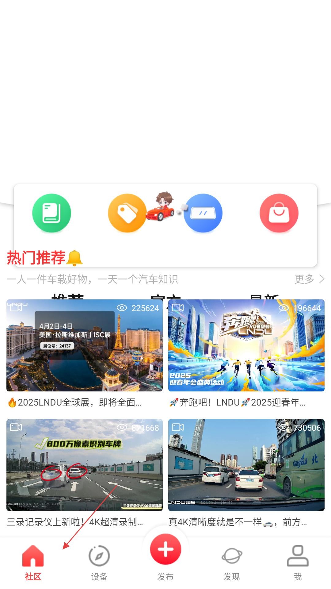 社区页展示热帖推荐、用车技巧、活动视频等内容。