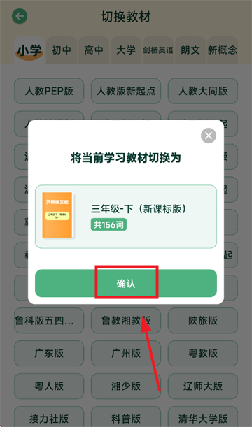 勾选目标教材后点击底部确认,系统会自动加载新词库内容。