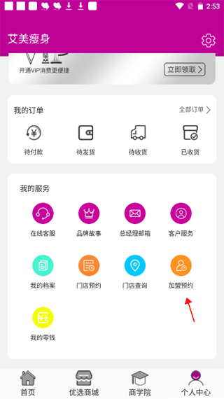 打开软件进入“个人中心”,在服务栏目中找到“加盟预约”。