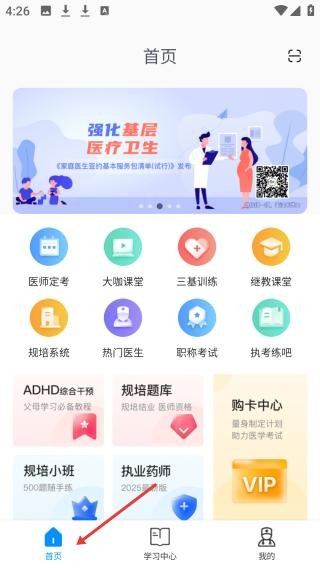 点击首页可进入多样学习版块,设有医师考试、大咖课堂等学习通道。