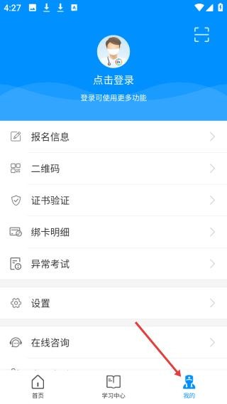 进入“我的”后可登录,支持报名查询、证书验证及在线咨询。