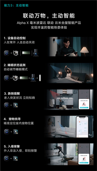 Alpha与毫米波雷达协同,实现多设备自动响应,提供沉浸式智能体验。