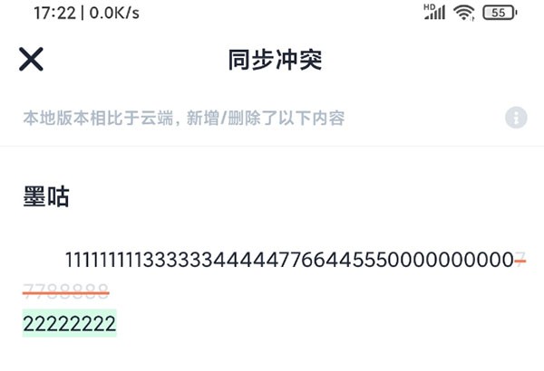 点开查看详情,按颜色提示进行查对,最终选择内容无误的本地版本或云端版本进行保留。