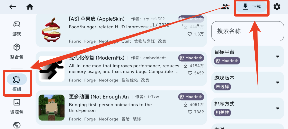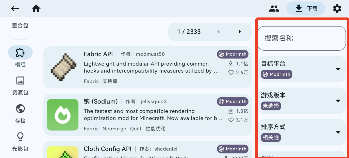 2、你可以慢慢找想要下载的模组,也可以在右侧通过筛选快速找到自己想要的模组。